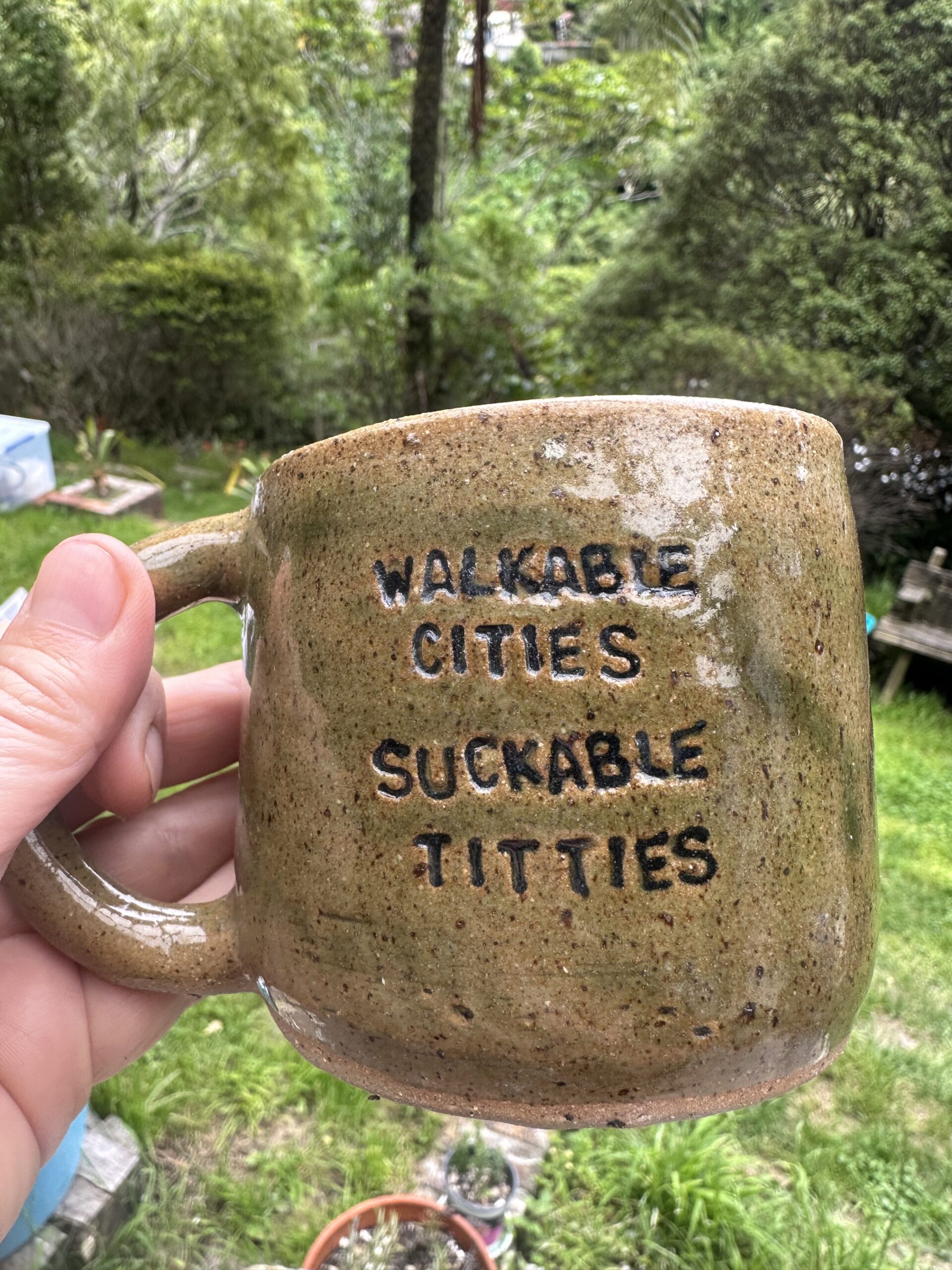 Handmade wheelthrown stoneware mug with WALKABLE CITIES SUCKABLE TITTIES stamped, reclaim glaze, fired to 1240C.